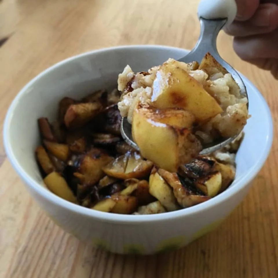 -Simmer apples on a skillet in Ghee or Coconut Oil, adding dashes of Cinnamon and Ginger until golden brown. Option to add any other spices such as Turmeric, Fennel or Cardamom too.