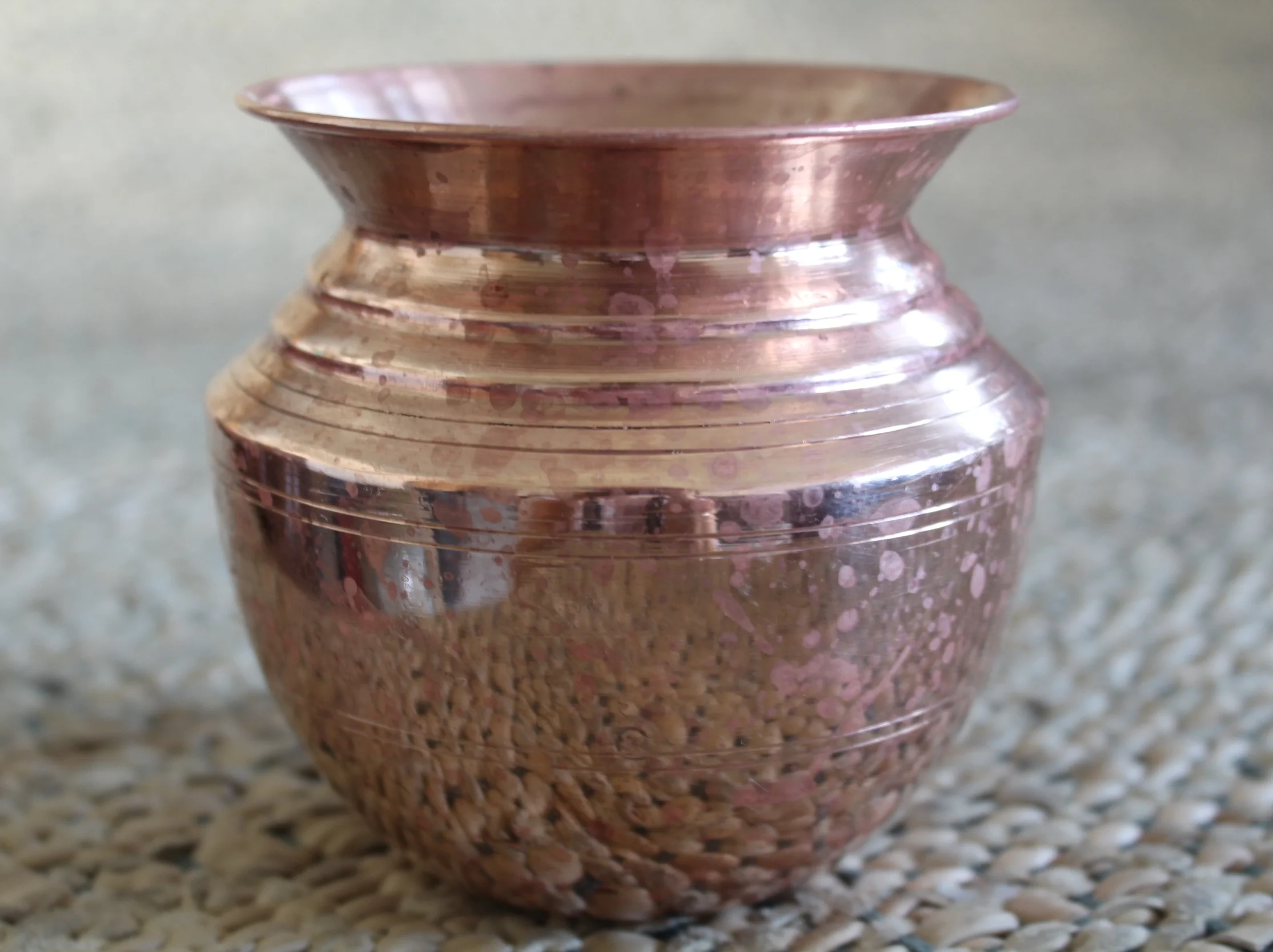 Drinking water left overnight in a copper vessel is recommended for overall wellness. It balances the Vata dosha, positively charges the water with ions, prevents aging, eliminates free radicals, aids in proper melanin production, and provides essential copper particles to the body. Storing water in copper vessels kills all bacteria and microbes present in the water too. Taking advantage of the oligodynamic effect of purifying water with Copper has been used for thousands of years by Yogis and is still used today in traditional Indian households.