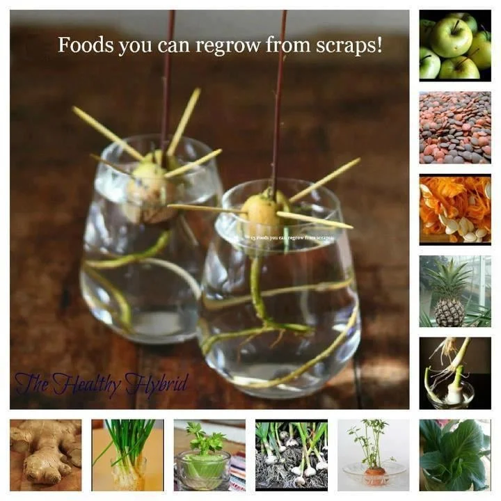 Growing a garden may require a little room, but regrowing a few things doesn't need to. Most of the time, you can put a stem / seed / cutting in a glass of water and it will grow roots. Leave it in water or transport it to a pot, give it away or put it in the ground somewhere. Why constantly buy food when you can start to grow your own? It's incredibly simple.
